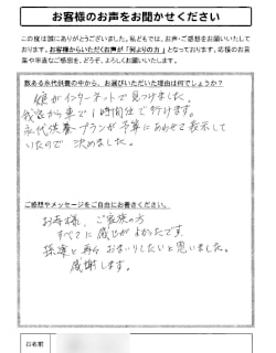 最明寺の永代供養墓をご利用いただいたお客様の中で、掲載のご許可をいただきましたお声を掲載させていただいております。お声をお寄せいただき誠にありがとうございます。今後ともどうぞよろしくお願いいたします。